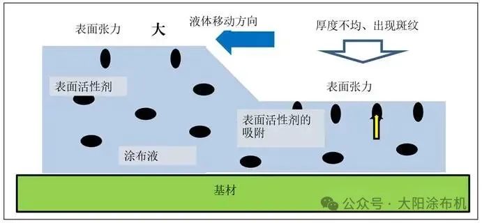 涂布面中心部位因表面張力作用導(dǎo)致涂布液向左右兩側(cè)擴散,而端部涂布液受表面張力單向牽引(僅向右),引發(fā)液體向右側(cè)遷移并形成局部增厚區(qū)域。