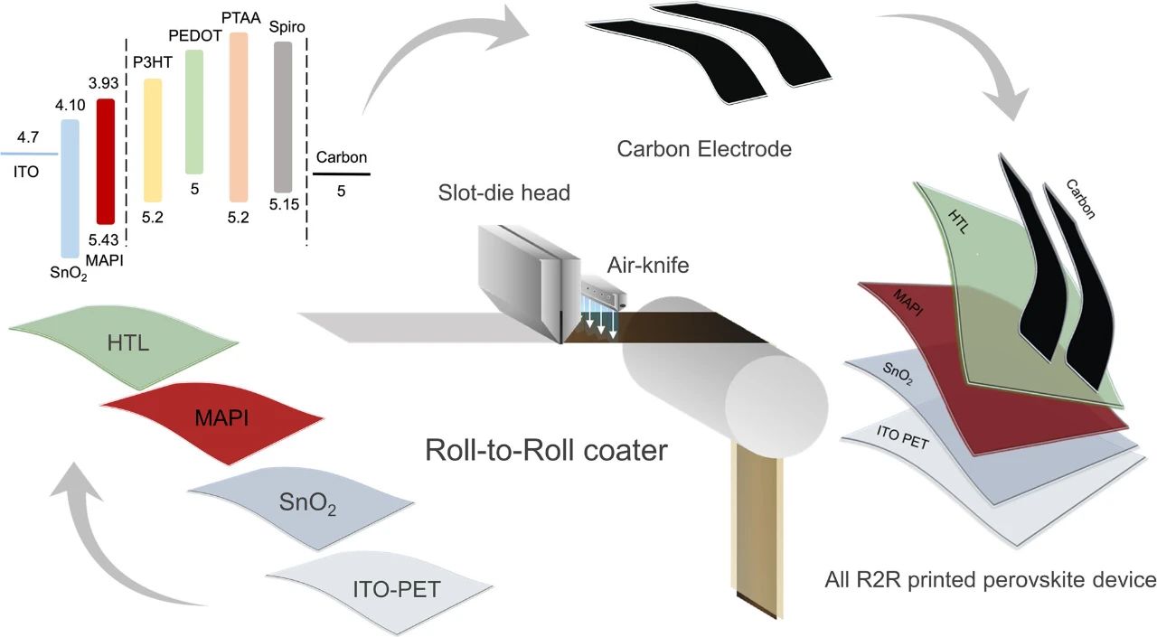 圖1展示了我們的涂層堆疊示意圖,包括的空穴傳輸材料有:spiro-MeOTAD、PTAA、P3HT和PEDOT,這幾種材料均有可能應(yīng)用到R2R涂布工藝中。