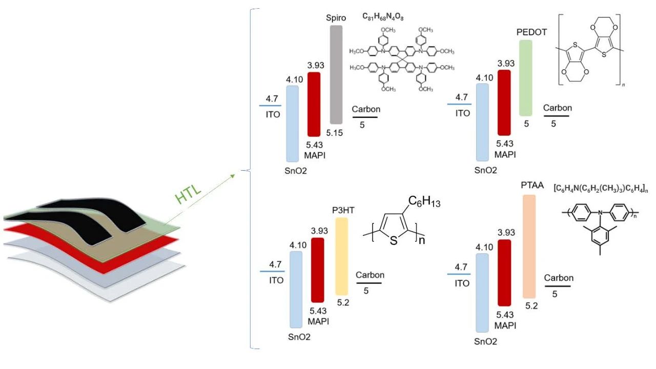 展示了采用多種空穴傳輸候選材料(包括spio - meotad、PTAA、P3HT和PEDOT)的平面NIP 堆疊[氧化錫(SnO2)/鈣鈦礦(MAPI)/HTL/碳]鈣鈦礦太陽(yáng)能電池的設(shè)計(jì)