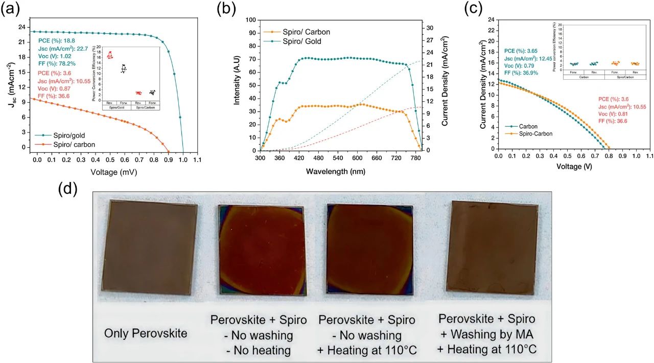 這種差異可以歸因于在螺線(xiàn)管/碳結(jié)構(gòu)中鈣鈦礦到碳電極的電荷轉(zhuǎn)移減少或電荷重組增加,而螺旋/金結(jié)構(gòu)顯示出更高的電流密度使電池具有更高的PV性能。