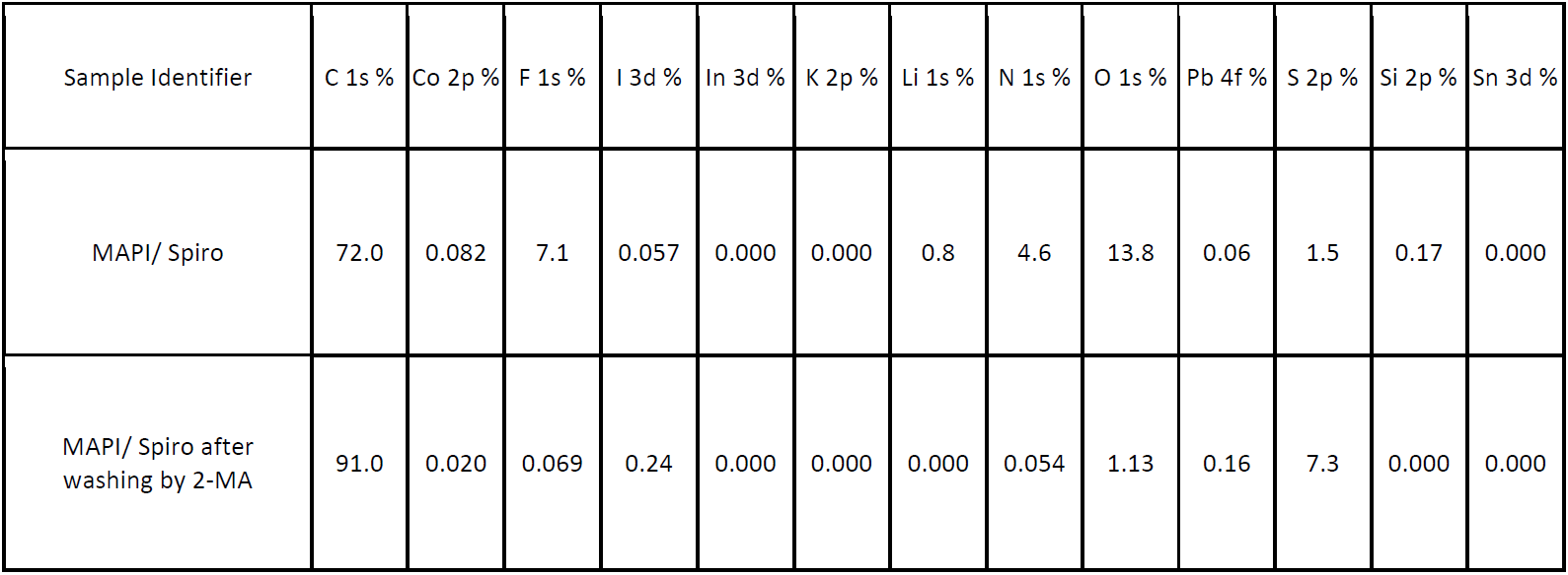 相反,這些發(fā)現(xiàn)說(shuō)明了Spiro層會(huì)發(fā)生分解或結(jié)構(gòu)改變,導(dǎo)致其空穴傳輸特性喪失。有無(wú)螺旋層的器件的J—V曲線(xiàn)和圖框PCE結(jié)果的相似情況進(jìn)一步說(shuō)明了在涂有碳層后部分去除螺旋層并發(fā)生化學(xué)變化的觀點(diǎn),如圖2c所示。此外,鈣鈦礦/螺旋樣品的實(shí)際照片也顯示出明顯的變化,如圖2d所示。由于成分的變化,加熱會(huì)輕微改變涂層的顏色(XPS補(bǔ)充表1),而用碳墨溶劑(2-甲基甲磺酸)洗滌涂層則會(huì)完全去除螺旋層。