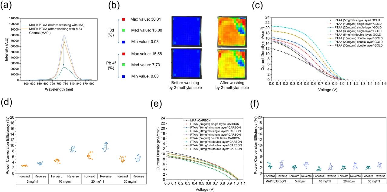 為了確定PTAA在鈣鈦礦層上的覆蓋范圍,于是在鈣鈦礦層表面檢測(cè)了碘化物和鉛兩種元素。從圖3b中可以看出,在洗滌之前樣品明顯有效地完全覆蓋了底層鈣鈦礦層。用溶劑洗滌樣品后獲得的XPS圖可以明顯觀察到表面有碘化物和鉛的跡象,驗(yàn)證了碳墨水部分去除下層PTAA的假設(shè)。結(jié)合這些結(jié)果,比較了碳電極器件和金電極器件的光伏性能。圖3c、d的J—V曲線(xiàn)和PCE圖框結(jié)果清楚地表明,PTAA/金電極器件的效率隨著PTAA濃度(厚度)的增加而提高。為了獲得更大的厚度,我們還生產(chǎn)了雙層涂層PTAA層的PSCs,曲線(xiàn)顯示,雙層涂層的PTAA濃度越高,電流密度越高(圖3c, d)。相反,圖3e, f顯示PTAA/碳電極器件在所有濃度下都表現(xiàn)出較低的轉(zhuǎn)化效率,幾乎沒(méi)有變化。我們還觀察到所有的金電極器件呈現(xiàn)s形曲線(xiàn),證實(shí)了之前弱PL淬火前溶劑洗滌的發(fā)現(xiàn)。即使PTAA/ 金電極設(shè)備是可操作優(yōu)化的(優(yōu)化功率轉(zhuǎn)換效率 ~12%),它們也可能不是空穴傳輸材料的最佳性能選擇,除非進(jìn)行額外的優(yōu)化。在PTAA/碳電極的PSCs中,無(wú)論層厚或溶液濃度如何,PV性能與PL和XPS結(jié)果相似,證明了PTAA和2-甲基甲磺酸是不相容的。