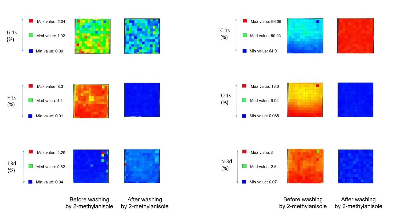 補(bǔ)充圖2 在用鄰甲苯胺洗滌前后,Spiro層中的Li、F、I、C、O和N元素的XPS元素圖譜。
