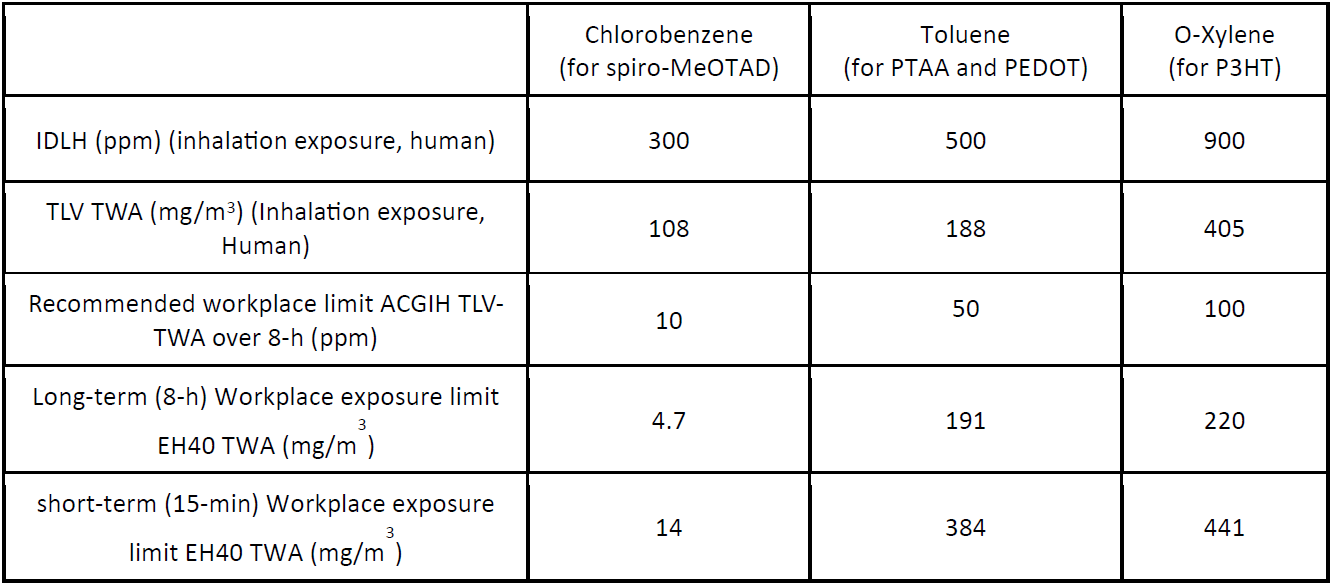 在深入研究了涂布有2-甲基苯胺基碳涂層的螺旋和PTAA的空穴傳輸材料的缺點(diǎn)和兼容性挑戰(zhàn)之后,我們的研究重點(diǎn)轉(zhuǎn)移到了另一種待定的空穴運(yùn)輸材料上。P3HT,這種材料不溶于2-甲基苯胺。P3HT因其在PSCs中作為導(dǎo)電、穩(wěn)定和經(jīng)濟(jì)的空穴傳輸材料而獲得了廣泛的認(rèn)可。值得注意的是,P3HT在高毒性溶劑氯苯和氯仿中表現(xiàn)出高溶解度,這兩種溶劑都因其潛在的健康危害而設(shè)有工作場(chǎng)所暴露限值。由于氯苯的工作場(chǎng)所暴露限值(WEL)很低,它的使用會(huì)受到一定限制, ACGIH設(shè)定的8小時(shí)時(shí)間加權(quán)平均(TWA)限值為10ppm。氯仿也有相同的ACGIH 8-h TWA限制為10ppm,這使得兩者都不適用于大面積的涂層系統(tǒng)。因此,它的應(yīng)用僅限于小體積的產(chǎn)品,以確保符合安全使用限制。且處理大量氯苯將需要執(zhí)行嚴(yán)格和昂貴的遏制和監(jiān)測(cè)措施,在考慮大規(guī)模使用這種溶劑時(shí),其所產(chǎn)生的環(huán)境影響將引起額外的關(guān)注。因此,需要使用低毒性的溶劑來(lái)取代氯苯并完全溶解P3HT。