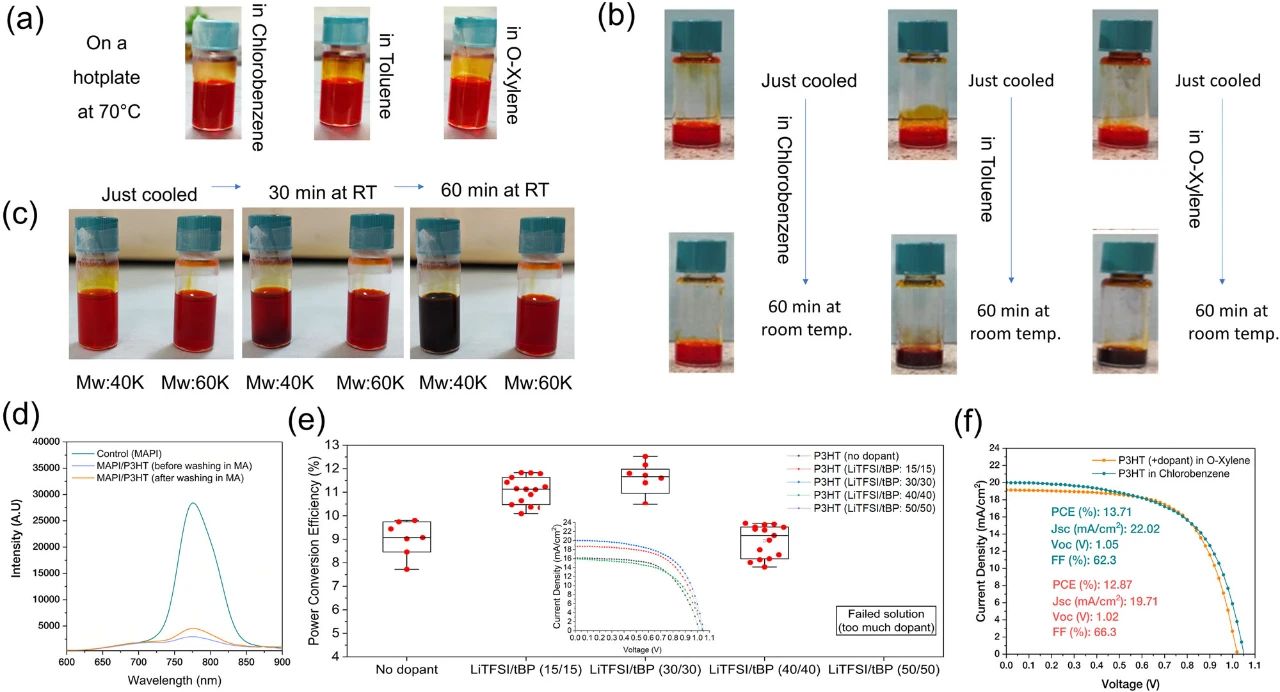 為了確定在選擇的低毒溶劑系統(tǒng)中的最佳溶解度,檢查了這些溶劑中含有的不同濃度的P3HT。觀察表明,當(dāng)放置在70°C的熱板上時(shí)(圖4a),所有三種溶劑都表現(xiàn)出很強(qiáng)的溶解P3HT的能力。但當(dāng)冷卻至室溫時(shí),P3HT在甲苯和鄰二甲苯中的溶解度與在氯苯中的溶解度不同。這些溶液經(jīng)歷了從清澈的橙色液體到深色凝膠狀態(tài)的快速轉(zhuǎn)變。(見(jiàn)圖4b)。