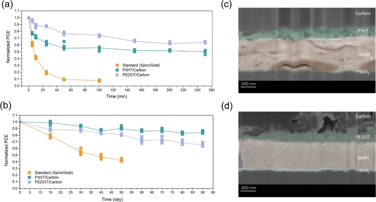 當(dāng)在D3條件下(65°C和85% RH)進(jìn)行測(cè)試時(shí),與使用P3HT的設(shè)備相比,含有PEDOT的設(shè)備具有較好的穩(wěn)定性。250分鐘后,PEDOT保留了初始功率轉(zhuǎn)換效率的70%,而P3HT保留了60%。與傳統(tǒng)的螺旋/金電極器件相比,PEDOT/碳電極器件和P3HT/碳電極器件都具有較好的濕度和溫度穩(wěn)定性。D1穩(wěn)定性測(cè)量結(jié)果表明,用P3HT涂層的器件表現(xiàn)出優(yōu)異的長(zhǎng)期穩(wěn)定性,在90天后保持其初始功率轉(zhuǎn)換效率的85%以上。使用PEDOT的設(shè)備也表現(xiàn)出相當(dāng)大的穩(wěn)定性,保持其初始功率轉(zhuǎn)換效率的75%以上。這種高穩(wěn)定性歸因于PEDOT、P3HT和碳的固有疏水性,形成了一種屏障,有效地阻止水分滲入鈣鈦礦層,從而使其具有高降解。