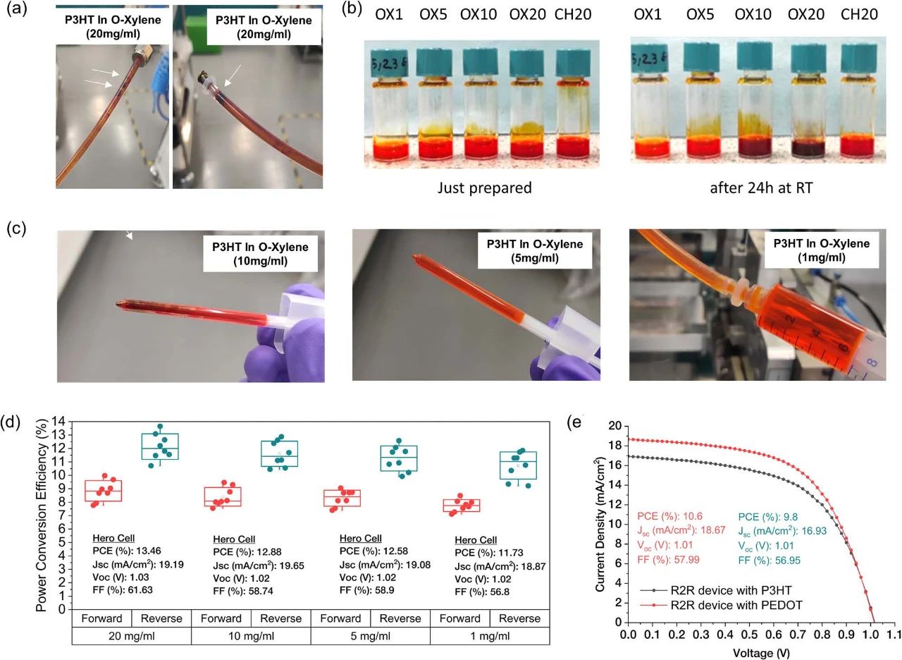 為了解決這一問(wèn)題,在鄰二甲苯中加入較低濃度(從20 mg ml - 1降至1 mg ml – 1)的P3HT進(jìn)行實(shí)驗(yàn)。圖7b比較了鄰二甲苯和氯苯中不同濃度(20、15、10、5和1 mg ml−1)的P3HT溶液的耐久性。觀察在室溫下保存24小時(shí)的小瓶的照片,發(fā)現(xiàn)在鄰二甲苯中的P3HT濃度低于10 mg ml−1時(shí)沒(méi)有凝膠化的跡象。圖7c進(jìn)一步支持了P3HT在濃度低于10 mg ml−1的o -二甲苯中溶解時(shí)不會(huì)沿著管壁聚集的觀點(diǎn)。圖7d顯示了不同濃度P3HT的自旋涂布器件的結(jié)果,通過(guò)將濃度從20 mg ml - 1降低到1 mg ml – 1,由于其較低的厚度使功率轉(zhuǎn)換效率略有下降。