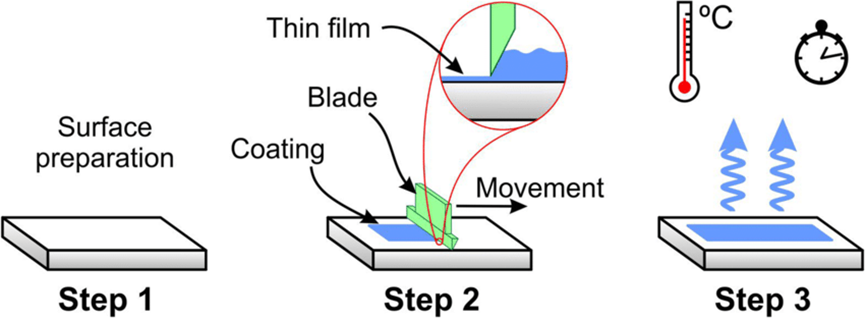 刮刀涂布是一種簡單、低成本可大規(guī)模涂布技術。其運作原理是通過移動刀片或基板 (substrate),刮涂前驅體溶液來制備大面積薄膜(如圖3所示)。其最大的優(yōu)勢為僅需極少量的前驅體溶液,改進了旋轉涂布法中浪費大量溶液的缺點。原則上,所制備的薄膜厚度可透過調(diào)整前驅體溶液濃度、刀片的移動速度、基板的性質以及刀片與基板之間的距離來控制。