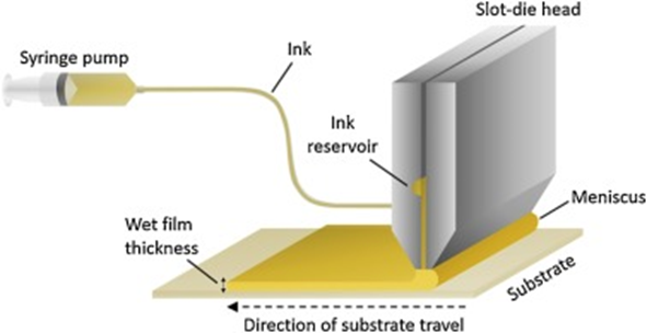 狹縫涂布法已廣泛應用于連續(xù)大規(guī)模涂布制程,是非常適合卷對卷制程的涂布技術。狹縫涂布裝置包含兩個獨立的可移動刀片,兩刀片之間的間隙構成一個狹縫,可供墨和進行流量控制(如圖4所示)。與刮刀涂層法相似,薄膜厚度可以透過調(diào)整前驅體溶液濃度、基板的性質和刀片與基板之間的距離來控制,而油墨特性 (黏度和濃度)、抽墨噴涂速度、基材移動速度和刀片之間的狹縫尺寸也是薄膜性質的可控件。因此,狹縫涂布法目前普遍被認為是最適合工業(yè)大規(guī)模生產(chǎn)的涂布技術。
